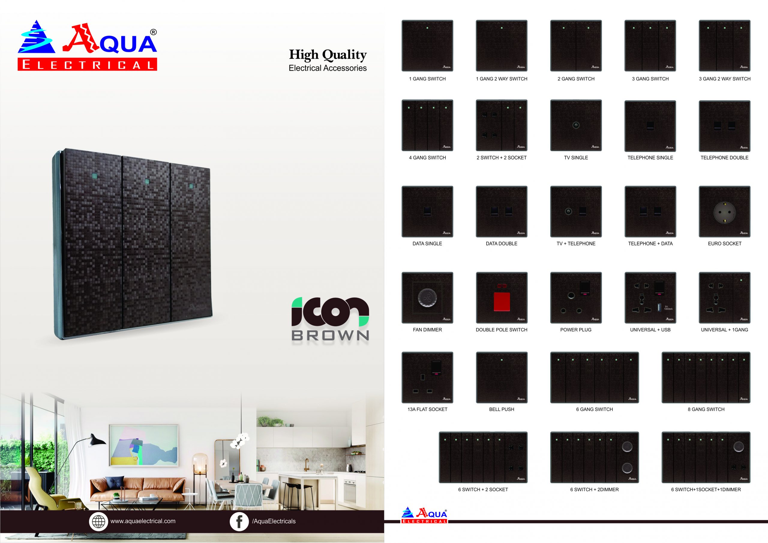 Aqua Icon Brown 6 Gang Switch Plus 2 Sockets